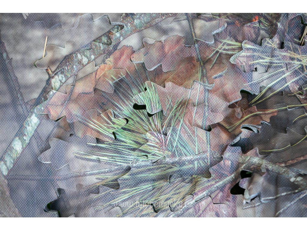 3D maskovací přehoz z trvanlivého materiálu. Je určen pro vytvoření stacionárního krytu v lese, u pole nebo rybníku. Vysekané lístky vytváří 3D efekt a je přes ně vidět ven. Kryt maskovaný tímto typem přehozu je možné velice snadno domaskovat okolním porostem. Materiál je textilní fólie (podobná jako např. pod zeleninu). Vydrží déšť, ale životnost zkracuje přímý sluneční svit.